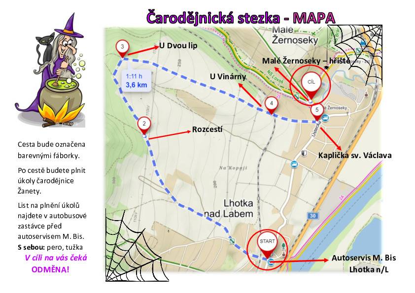List na plnění čarodějnických úkolů najdete v autobusové zastávce před autoservisem M. Bis – ve Lhotce nad Labem. Trasa bude značena fáborky.