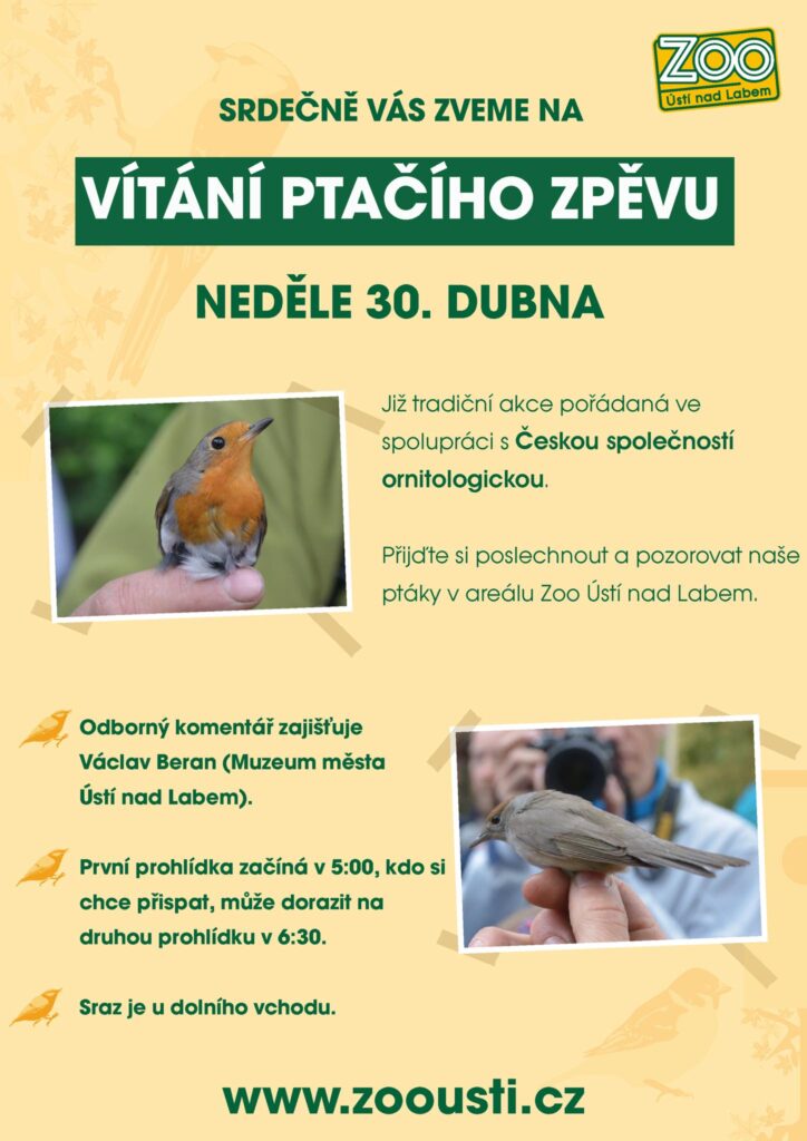 Ústí nad Labem – Ranní ptáče dál doskáče! Pokud se ztotožňujete s tímto pořekadlem a nepotřebujete v neděli dlouho vyspávat, přijďte 30. dubna do ústecké zoologické zahrady na Vítání ptačího zpěvu.