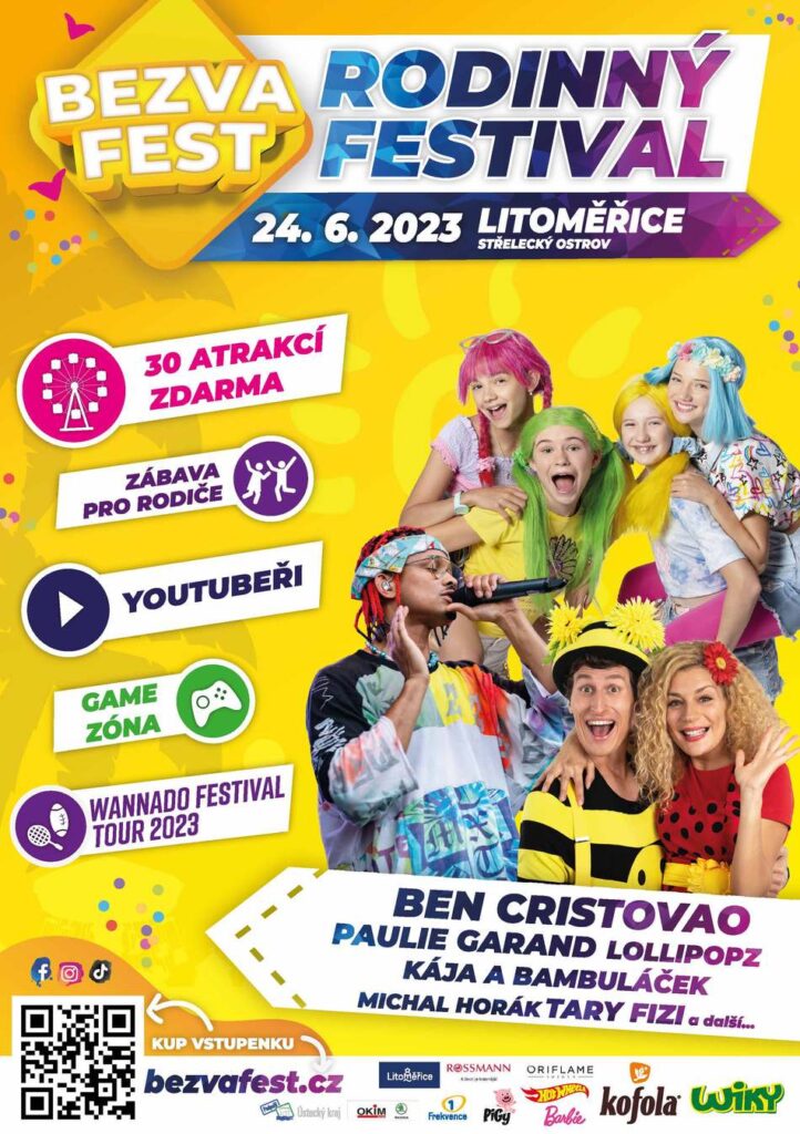 Litoměřice – Zábavný rodinný festival Bezva Fest se po roce vrací opět do Litoměřic. 24. 6. 2023 na Střeleckém ostrově čeká návštěvníky několik bezva zón, 30 atrakcí zdarma, nejdelší nafukovací překážková dráha v ČR, youtuberská stage a mnohem více. Hlavní hvězdou bude Ben Cristovao, Lollipopz nebo Smejko a Tanculienka. To vše v ceně vstupného. Zažijte se svojí rodinou nejbezvadnější den ve vašem životě. Lístky naleznete v předprodeji v síti Ticketportal do vyprodání zásob. Letošní novinkou je Bezva Fest Tour po 5 městech v ČR.