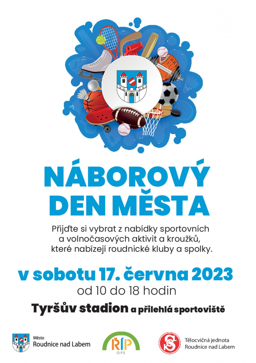 Roudnice nad Labem – V sobotu 17. června na Tyršově stadionu v Sokolské ulici a přilehlých sportovištích proběhne první náborový den Města Roudnice nad Labem. Přijďte se svými dětmi a užijte si společně den vyzkoušením mnoha různých sportovních i dalších volnočasových aktivit, nabízených místními kluby a organizacemi.
