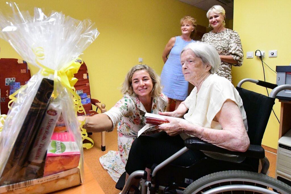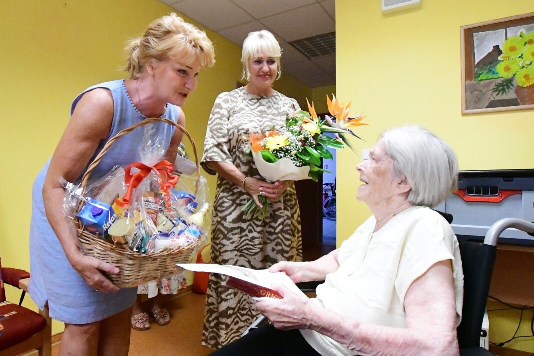 Kromě pamětního listu jí s přáním pevného zdraví obě předaly květinu a dárkový koš. Mezi gratulanty nechyběly ani zaměstnankyně domova a zástupkyně okresní zprávy sociálního zabezpečení.