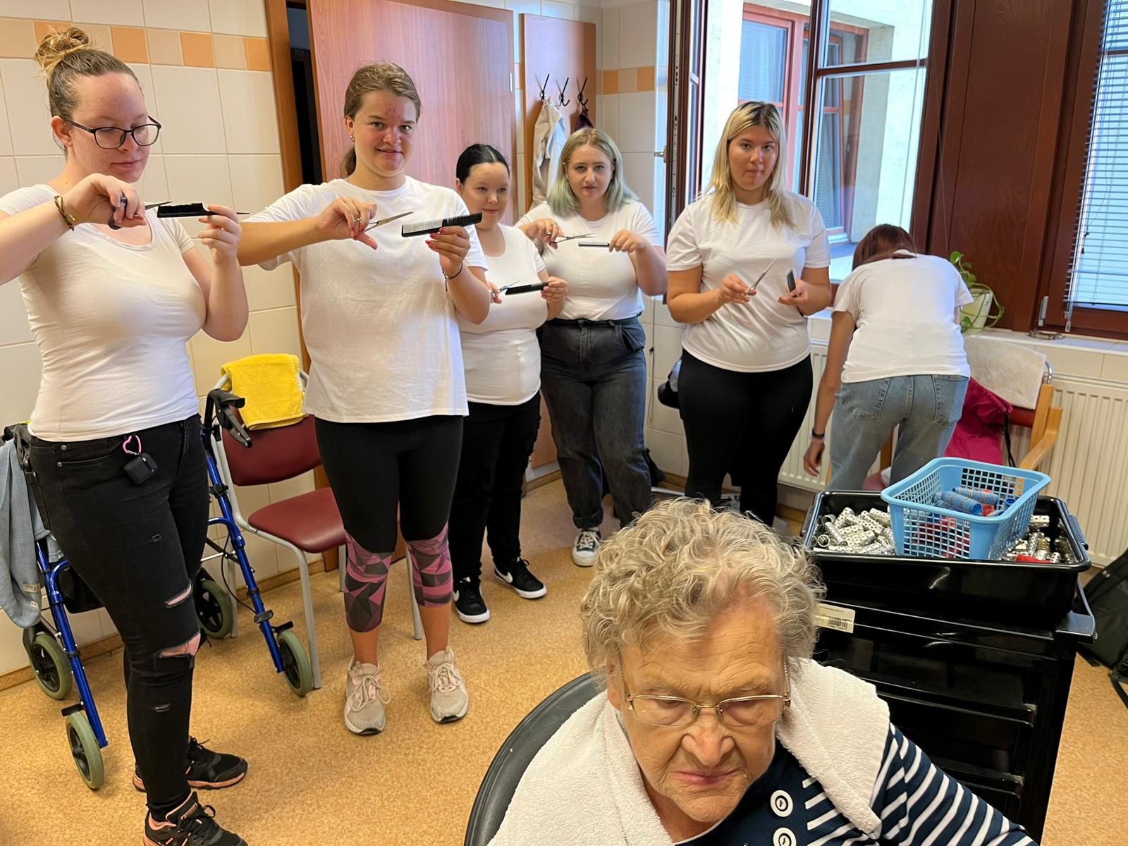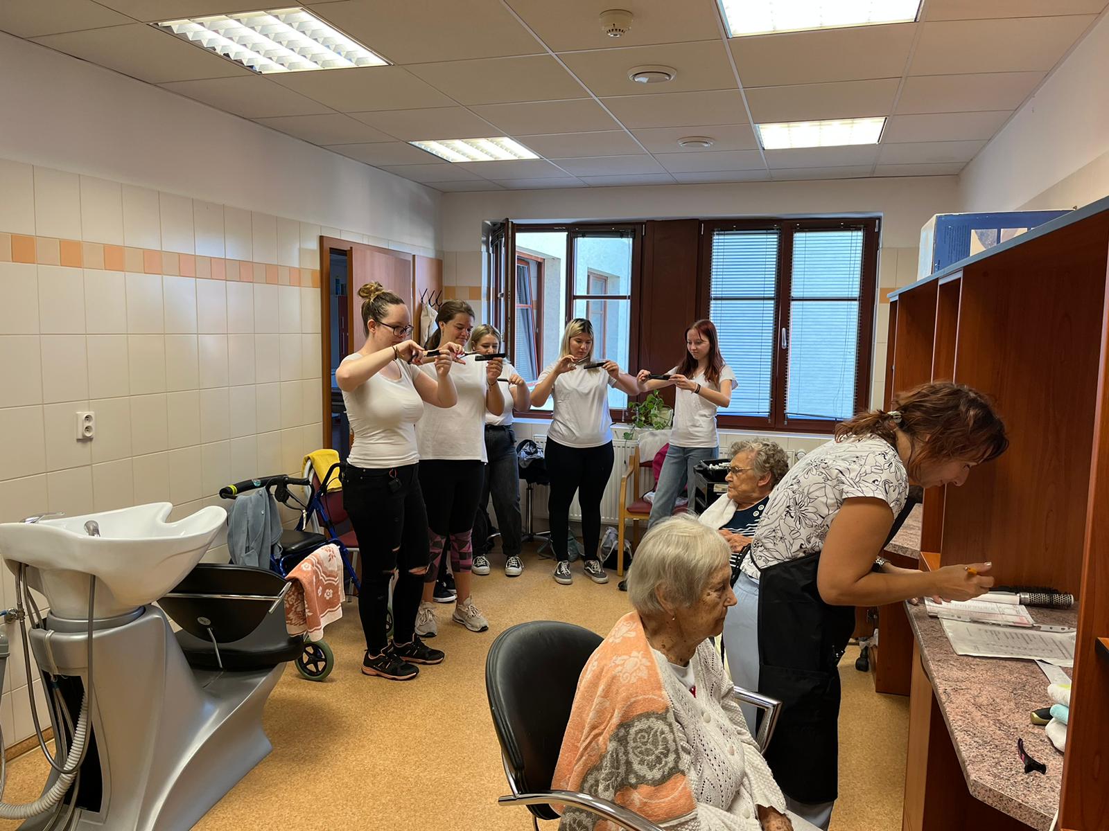 První den výuky odborné praxe žáků oboru Kadeřník SŠ a MŠ Litegra Litoměřice se budoucí kadeřnice věnovaly seniorům, konkrétně z Domova na Dómském pahorku. Na fotografiích jsou žákyně prvního ročníku oboru Kadeřník. Do domovů seniorů v Litoměřicích žákyně a žáci z Litegry s učitelkami odborného výcviku pravidelně docházejí a poskytují kadeřnické služby seniorům. Níže najdete fotografie stejné služby z Domova seniorů U Trati v Litoměřicích (rovněž kadeřnice z prvního ročníku).