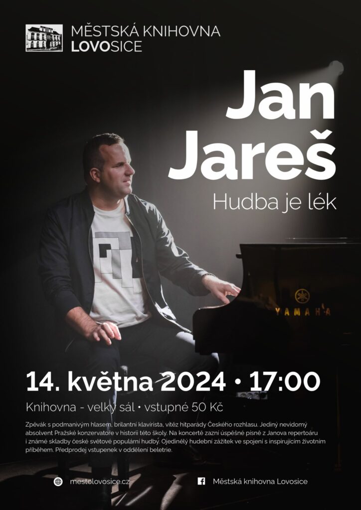 Lovosice – Sál Městské knihovny Lovosice bude v úterý 14. května hostit zcela mimořádný koncert. Od 17 hodin zde totiž bude vystupovat Jan Jareš – nevidomý zpěvák a klavírista. Pořad nese název „Hudba je lék,“ vstupné 50,- Kč. Předprodej lístků v oddělení beletrie.