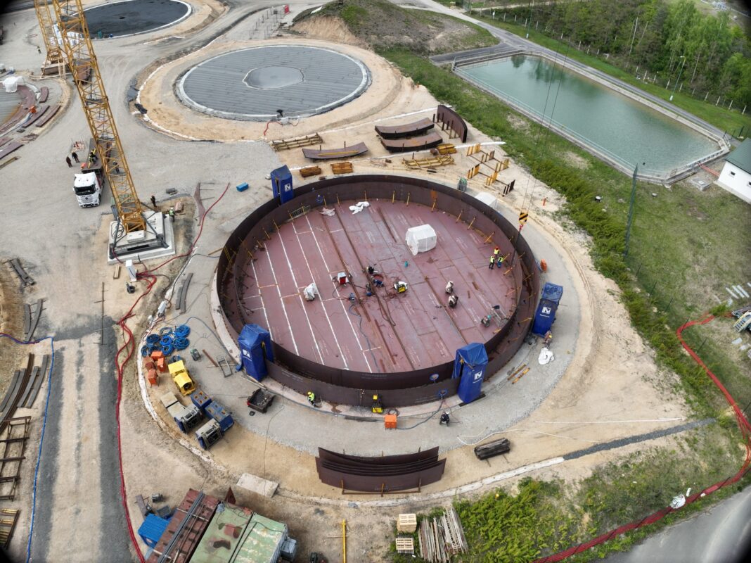 Na staveništi, nad kterým se do výšky přes 60 metrů tyčí dva věžové jeřáby, již započaly práce na montáži čtyř ocelových zásobníků, které budou mít po dokončení výšku 18 m a průměr 34 m. Opodál již čekají na montáž ocelových konstrukcí zásobníků hotové základové desky pro zbylé dva zásobníky. Základové desky zásobníků musí být schopné unést 10 500 tun, což odpovídá hmotnosti více než 260 plně naložených kamionů. Dalším prvkem, kterým základové desky vzbudí zájem, je neobvyklý trychtýřovitý tvar, který umožní snadné vyčerpání skladovaného produktu.