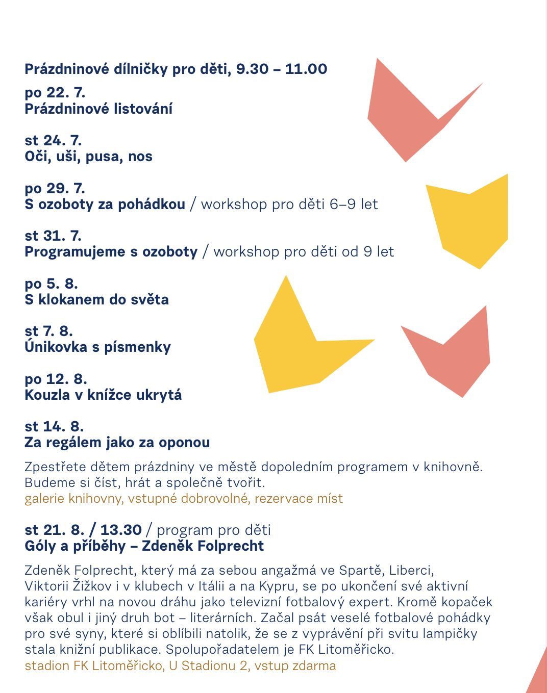 První dílnička se uskuteční v pondělí 22. července a věnovat se bude listování. Prázdninový program pro děti zakončí 21. srpna fotbalový expert, autor dětské knížky a bývalý český profesionální fotbalista Zdeněk Folprecht s programem Góly a příběhy. Díky spolupráci s FK Litoměřicko si bude povídat o veselých fotbalových pohádkách se všemi zájemci a to přímo na stadionu FK Litoměřice.
