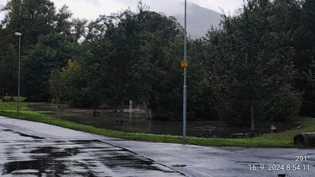 Dětské hřiště na Osmičce už je celé pod vodou a voda se rozlévá do broukoviště.