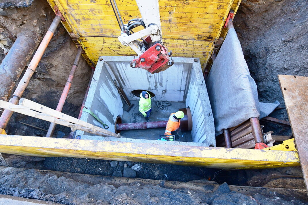 V současné době se stavební činnost odehrává přímo v prostoru křižovatky, kde firma mimo jiné buduje novou šachtu a stoku (na snímku). Práce v tomto místě mají trvat přibližně dva měsíce.