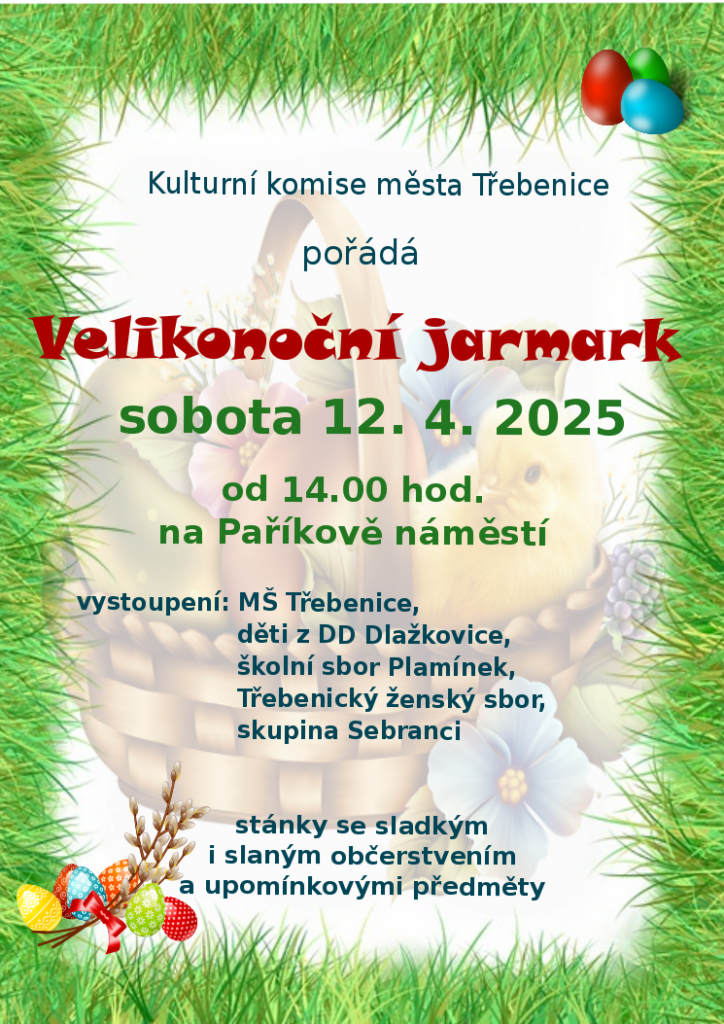 Třebenice – Přijďte přivítat jaro do Třebenic! Už tuto sobotu 12. dubna se na Paříkově náměstí koná vyhlášený VELIKONOČNÍ JARMARK. Dorazit musíte v hojném počtu! Nachystán je bohatý kulturní program a také spousta občerstvení a krásných výrobků!