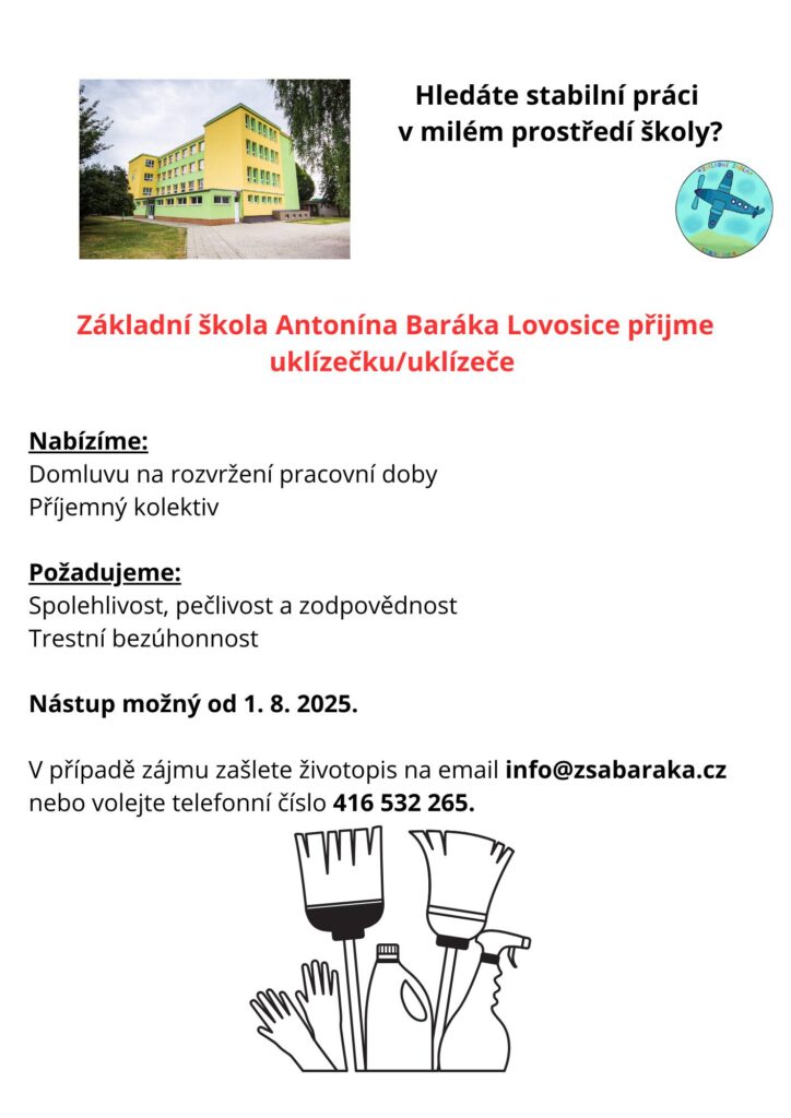 VOLNÁ MÍSTA: Uklízečka v ZŠ Antonína Baráka v Lovosicích