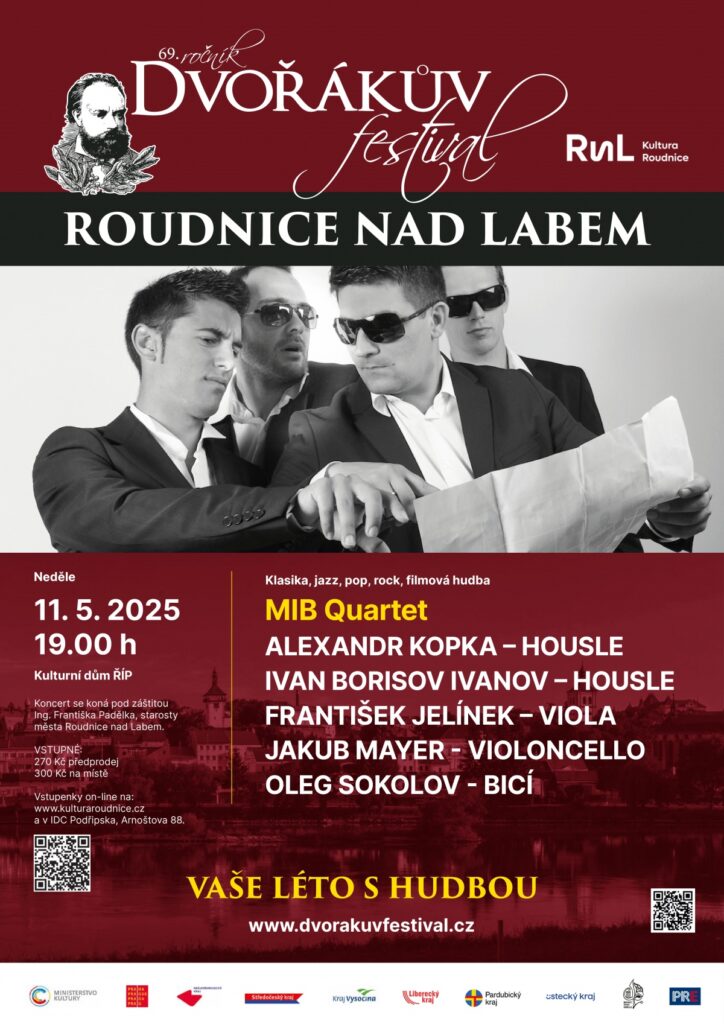 Roudnice nad Labem – Největší hudební událost svého druhu v Česku – Dvořákův festival – opět míří i do Roudnice nad Labem. Hudební slavnost, která se letos odehraje v sedmi krajích ČR, do Kulturního domu Říp v neděli 11. května přiveze MIB QUARTET. Jedinečný koncert tohoto moderního smyčcového kvarteta začíná v 19 hodin.