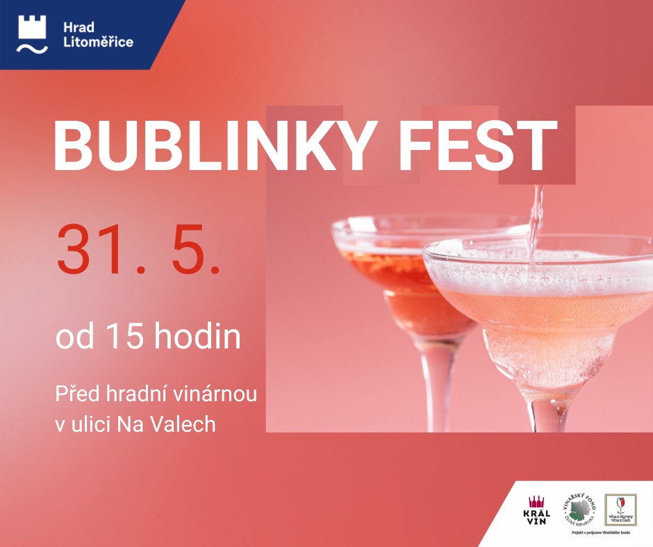 Litoměřice – Nalaďte se do růžova a přijďte v sobotu 31. května do parku před hradní vinárnu v ulici Na Valech na vůbec první BUBLINKY FEST v Litoměřicích. Začne úderem 15. hodiny a potrvá až do večera. Máte jedinečnou šanci ochutnat ta nejlepší Frizzante, Pet-Nat a růžová vína z českých a moravských vinařství.