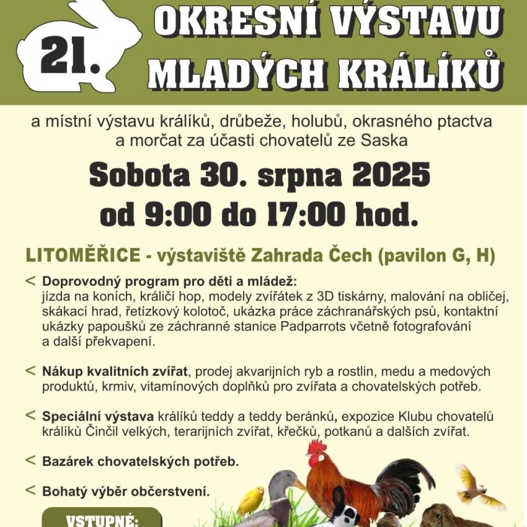 Český svaz chovatelů, ZO Litoměřice – Žitenice, zve srdečně na 21. Okresní výstavu mladých králíků spojenou s místní výstavou králíků, drůbeže, holubů, morčat a okrasného ptactva. Akce proběhne v sobotu 30. srpna 2025 na Výstavišti Zahrada Čech v Litoměřicích. Výstava bude otevřena od 9 do 17 hod. Nebudou chybět další doplňkové expozice zvířat. Možnost nákupu kvalitních zvířat, bude zajištěn prodej krmiv. Na výstavě bude možno zakoupit chovatelské potřeby a vitaminové doplňky pro zvířata.