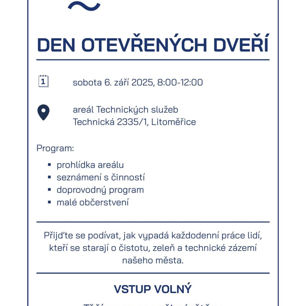 Litoměřice – Technické služby města Litoměřice pořádají tuto sobotu 6. září Den otevřených dveří. Od 8 do 12 hodin máte jedinečnou možnost prohlédnout si areál technických služeb a dozvědět se vše o činnosti této organizace. K dispozici bude také drobné občerstvení.