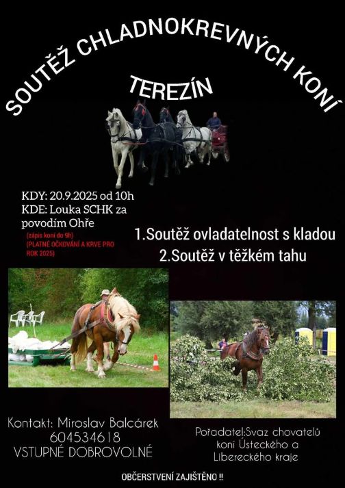 TEREZÍN – V sobotu 20. září 2025 se louka SCHK za povodím Ohře v Terezíně stane dějištěm jedinečné akce pro milovníky koní i venkovských tradic. Od 10:00 hodin tu odstartuje soutěž chladnokrevných koní, kterou pořádá Svaz chovatelů koní Ústeckého a Libereckého kraje.