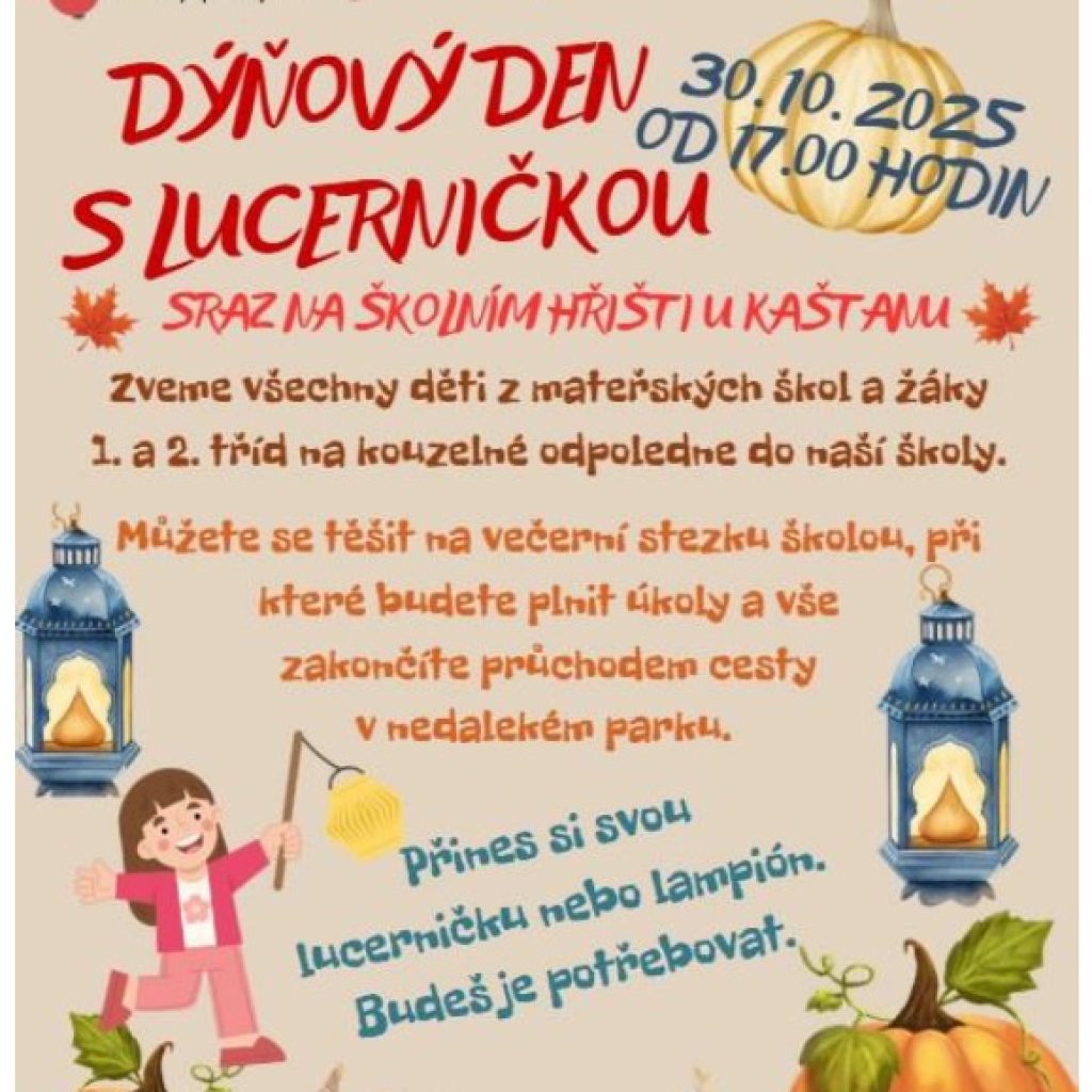 Lovosice – Základní škola Sady Pionýrů v Lovosicích pořádá ve čtvrtek 30. listopadu Dýňový den s lucerničkou. Sraz je v 17 hodin na hřišti u kaštanu, přičemž lucerničky a lampiony s sebou! Budete je potřebovat!