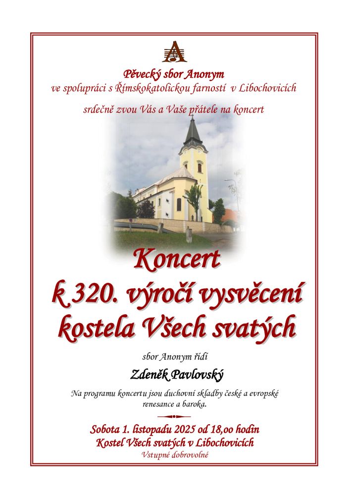 LIBOCHOVICE – V sobotu 1. listopadu 2025 od 18 hodin se v kostele Všech svatých v Libochovicích uskuteční slavnostní koncert pořádaný k příležitosti 320 let od vysvěcení tohoto významného chrámu.