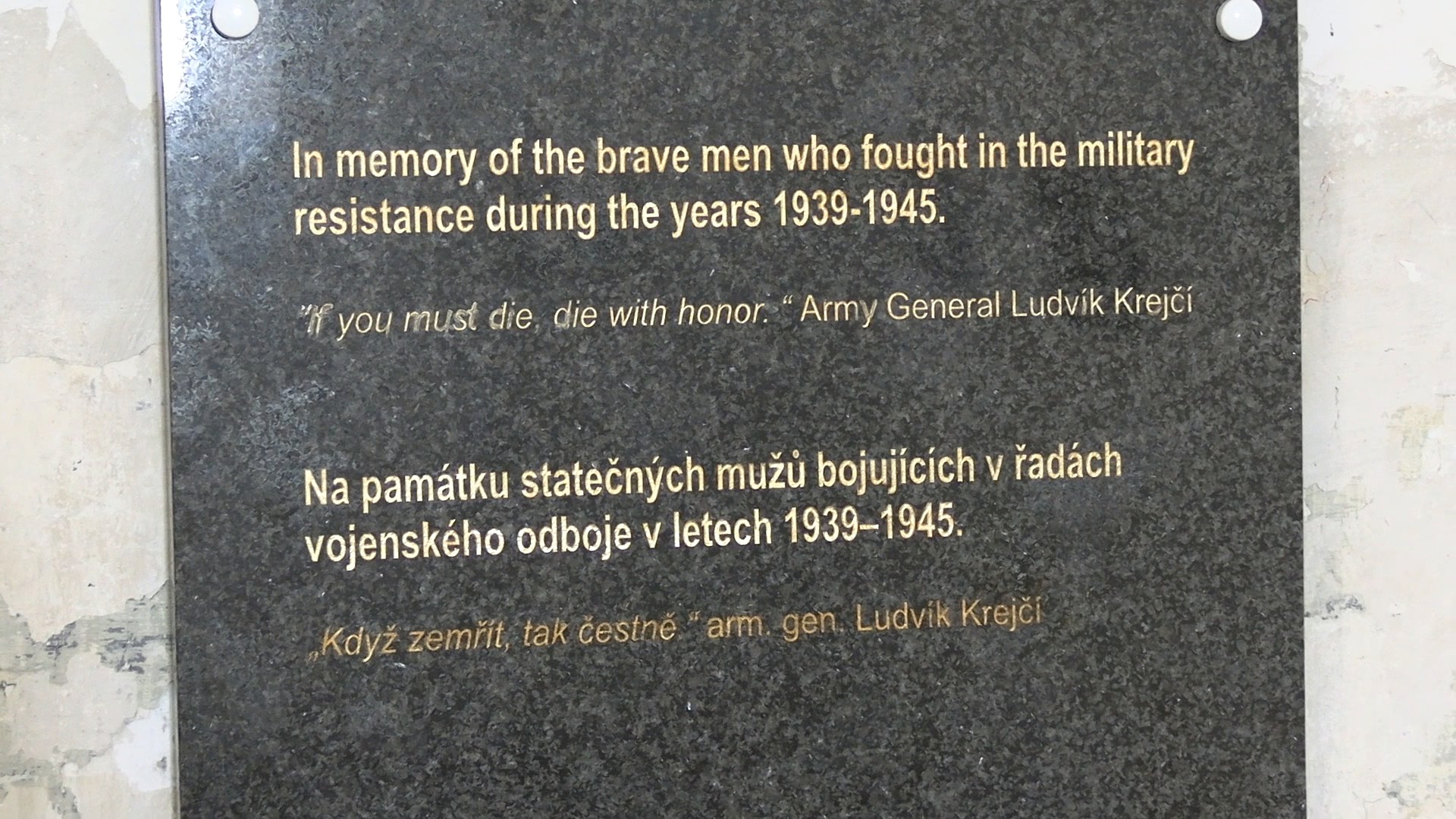 Deska nese citát armádního generála Ludvíka Krejčího: „Když zemřít, tak čestně.“, který symbolicky podtrhuje odvahu a odhodlání československých vojáků bojujících proti nacistické okupaci.
