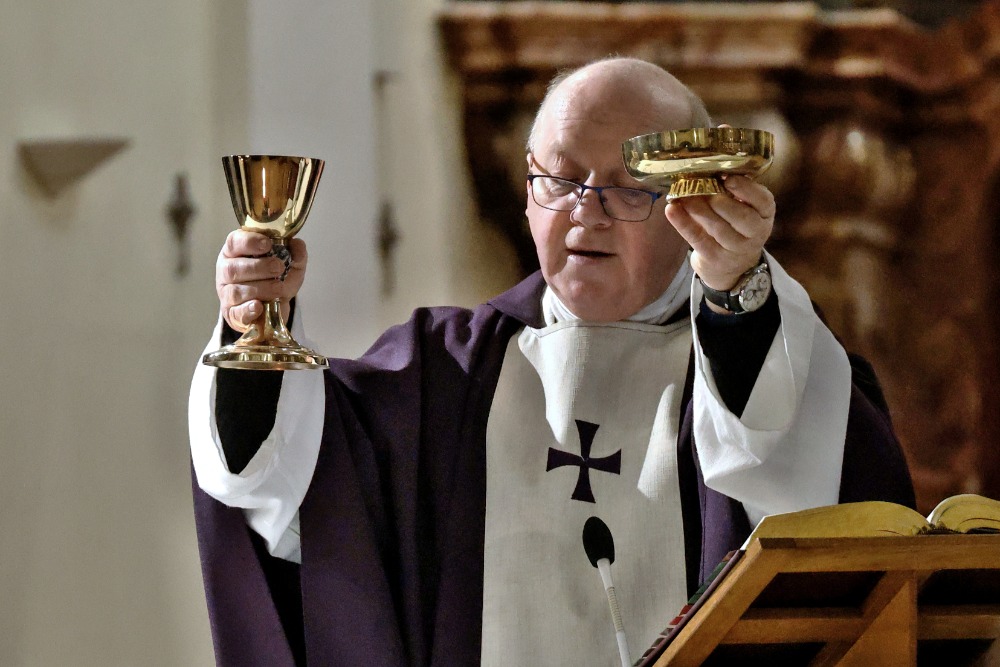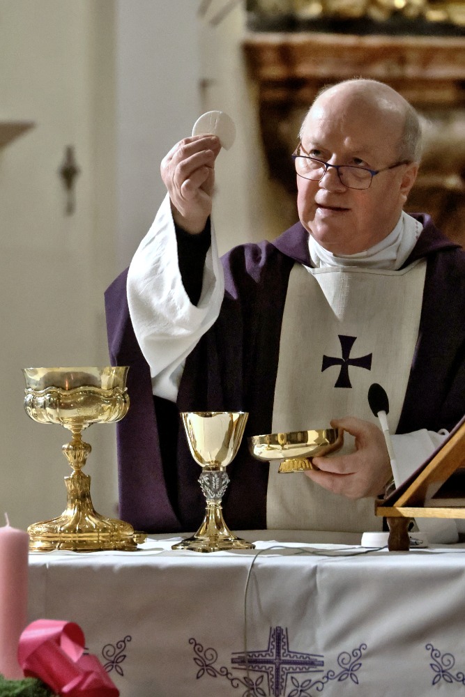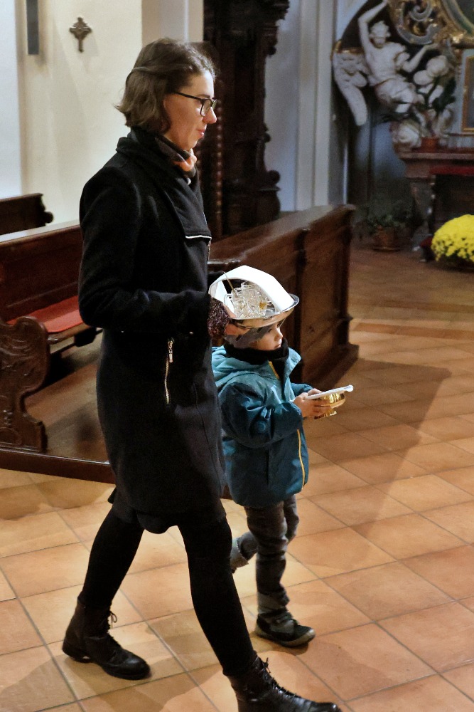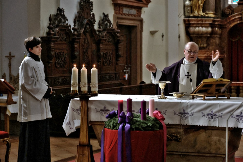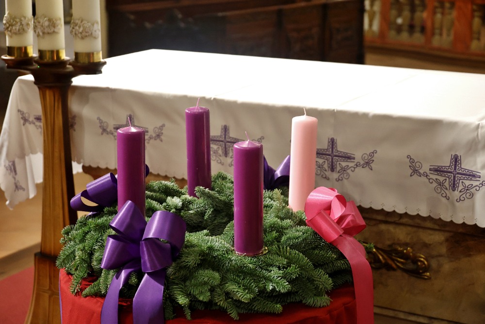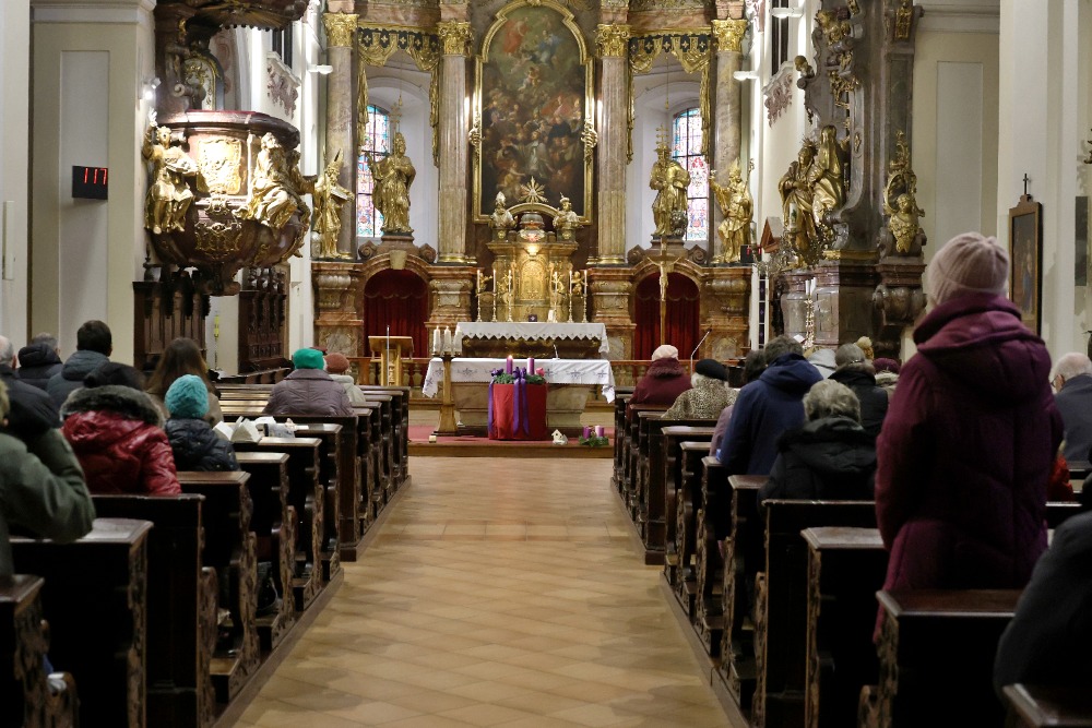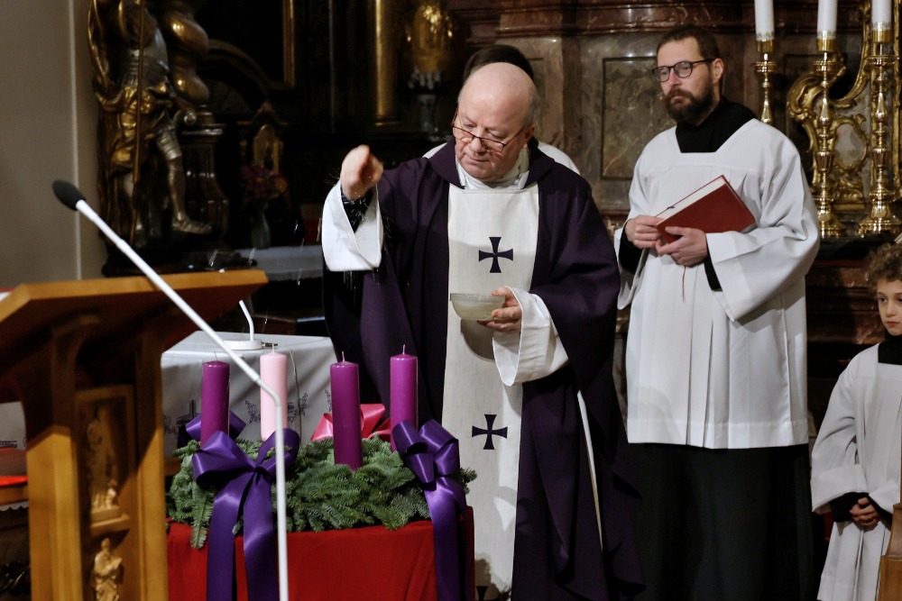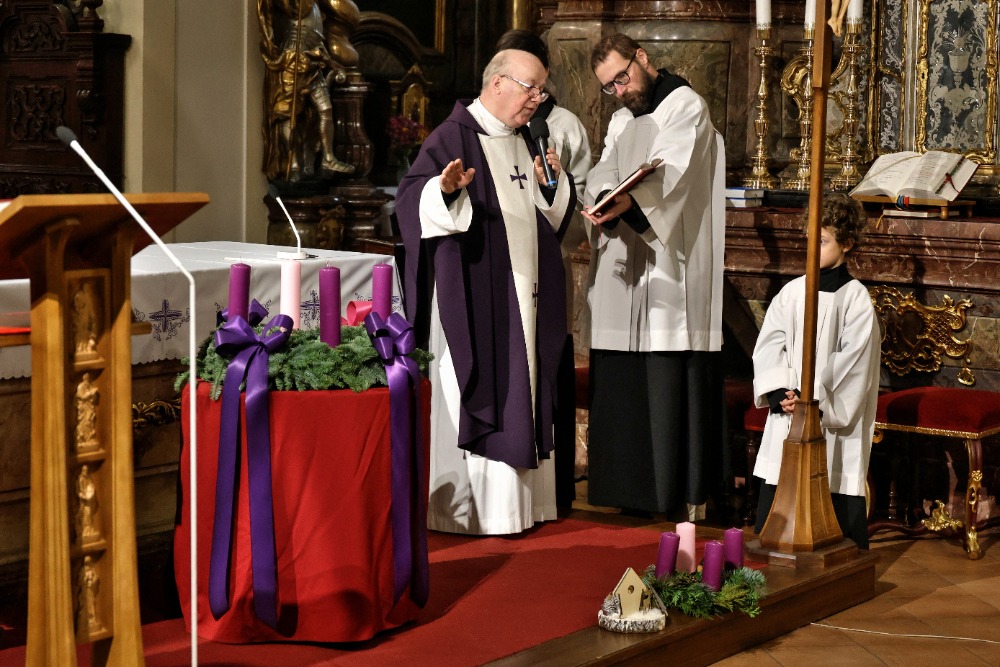 LITOMĚŘICE – Malý Filip Žonca rozsvítil první svíčku na adventním věnci v děkanském kostele Všech svatých v Litoměřicích. V liturgickém rouchu fialové barvy sloužil nedělní první adventní mši probošt Mons. Józef Szeliga, který v úvodu požehnal farníkům adventní svícny.