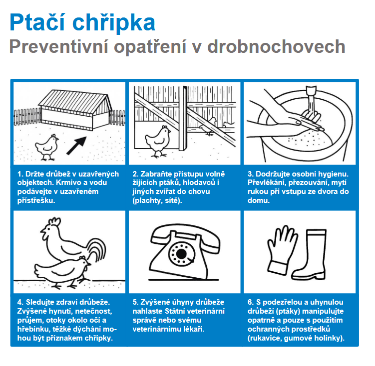 Dočasně je rovněž zakázáno přemisťování drůbeže, vajec a dalších produktů, stejně jako pořádání výstav, trhů nebo jiných akcí se shromažďováním ptáků.