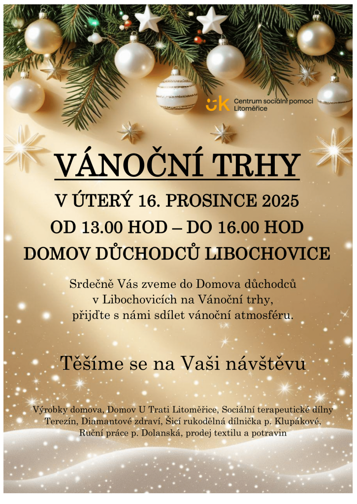 Centrum sociální pomoci Litoměřice Vás srdečně zve na Vánoční trhy v Domově důchodců Libochovice. Přijďte nasát vánoční atmosféru a podpořit dobrou věc!
