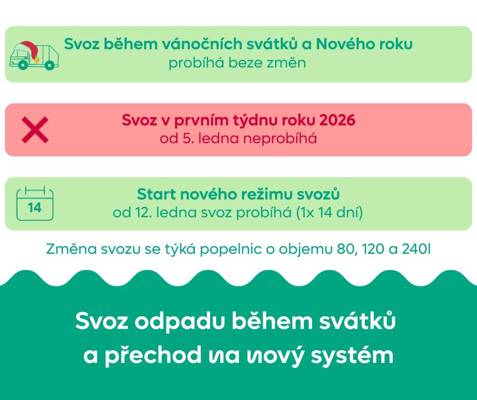 - První lednový týden (5.–11. 1.): Svoz neproběhne (poslední „starý“ svoz bude na Nový rok).