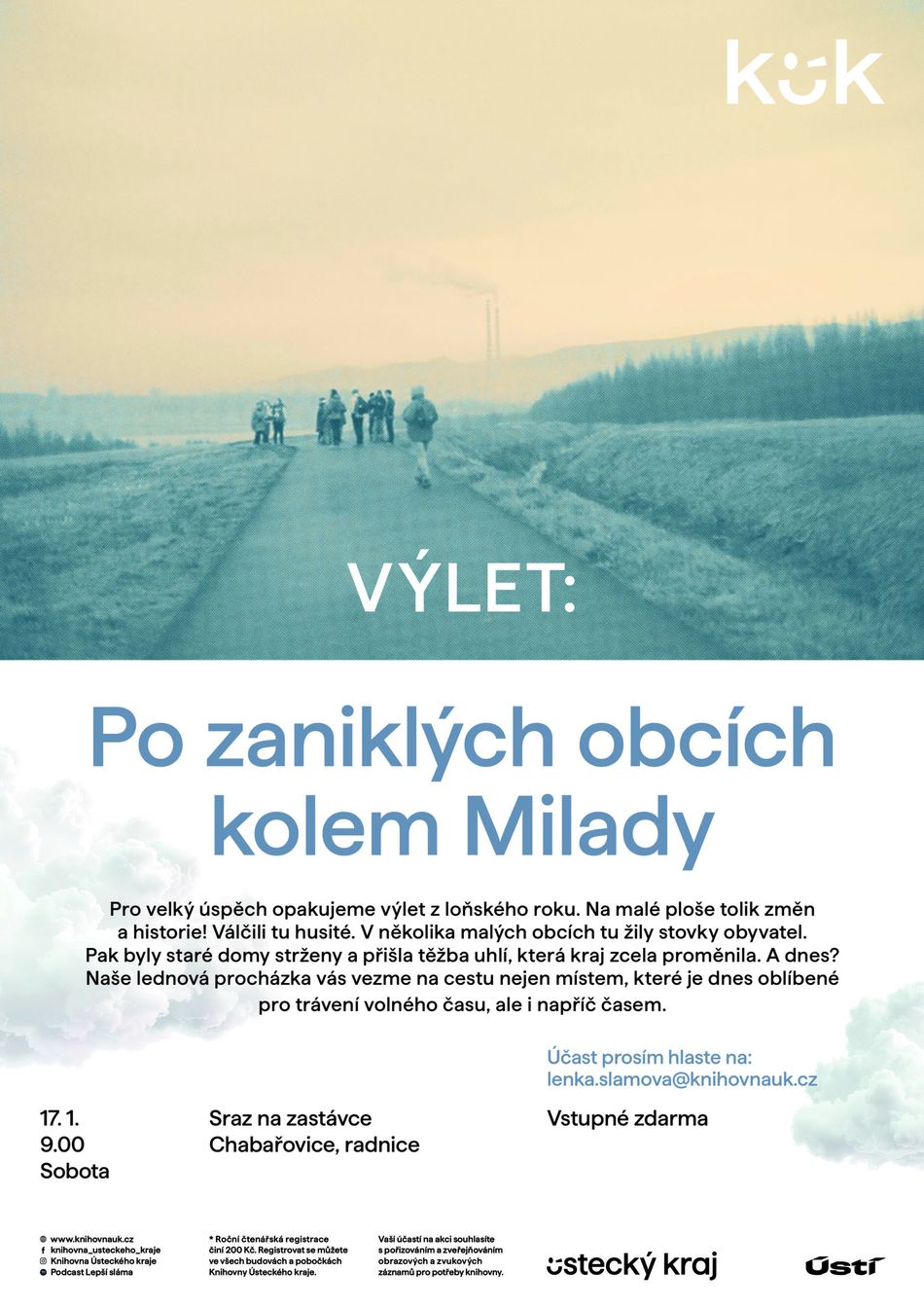 Pro velký úspěch opakujeme výlet z loňského roku. Na malé ploše tolik změn a historie! Válčili tu husité. V několika malých obcích tu žily stovky obyvatel. Pak byly staré domy strženy a přišla těžba uhlí, která kraj zcela proměnila. A dnes? Naše lednová procházka vás vezme na cestu nejen místem, které je dnes oblíbené pro trávení volného času, ale i napříč časem.