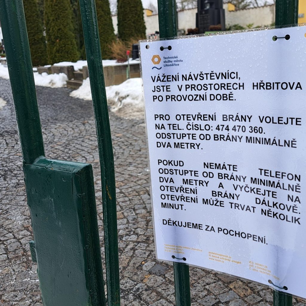 Litoměřice – Nový rok s sebou přinesl jednu novinku na Městském hřbitově v Litoměřicích. Obě vchodové brány se nyní zavírají elektronicky na dálku ze sídla Technických služeb města (TSM). Důvodem je legislativní změna a úspora.