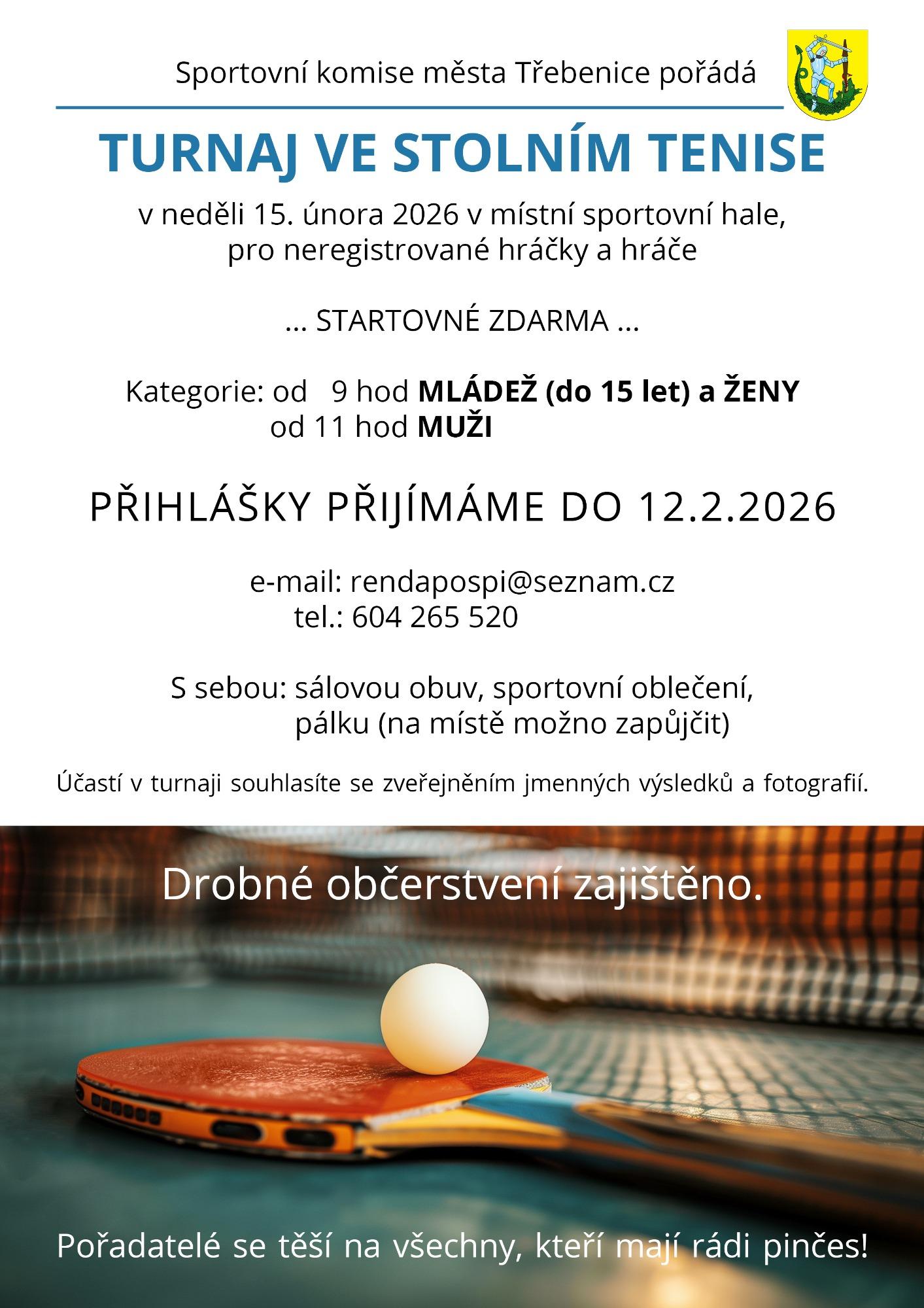 TŘEBENICE – Sportovní komise města Třebenice zve všechny příznivce stolního tenisu na amatérský turnaj, který se uskuteční v neděli 15. února 2026 v místní sportovní hale. Turnaj je určen výhradně pro neregistrované hráčky a hráče.