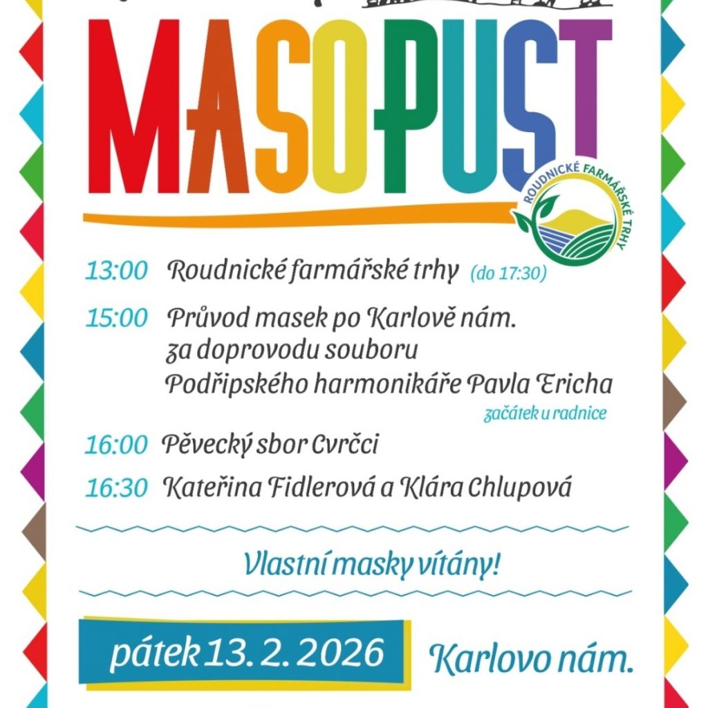 Roudnice nad Labem – Už tento pátek 13. února se koná ROUDNICKÝ MASOPUST. Tradiční lidová veselice začne v 15 hodin průvodem masek, který půjde za doprovodu harmonikáře od městského úřadu po Karlově náměstí.