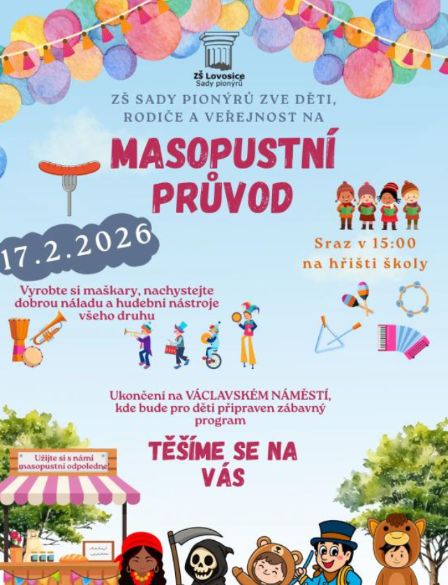 LOVOSICE – Základní škola Sady pionýrů v Lovosicích srdečně zve děti, rodiče i širokou veřejnost na letošní Masopustní průvod, který se uskuteční už zítra, v úterý 17. února 2026.