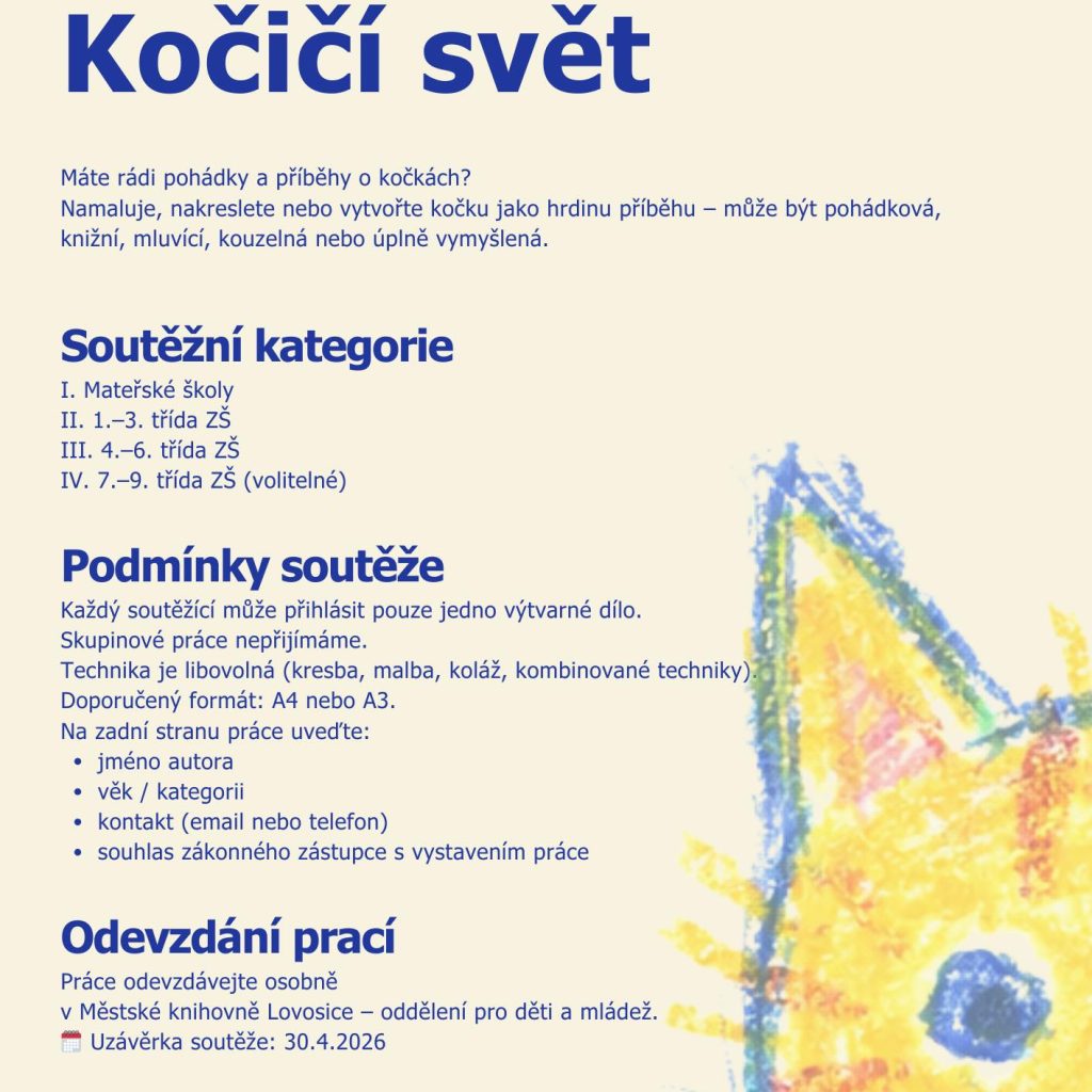 Lovosice – Až do 30. dubna mohou děti z mateřských a základních škol odevzdávat v dětském oddělení Městské knihovny Lovosice své obrázky a zapojit se tak do výtvarné soutěže „Kočičí svět.“