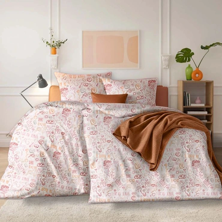 Bavlněné povlečení LOVE NOTES zaujme svou lehkou romantikou a elegantní jemností. Drobný vzor srdíček, písmen a symbolů lásky v tlumených pudrových, béžových a šedých tónech dodá ložnici harmonickou a útulnou atmosféru.