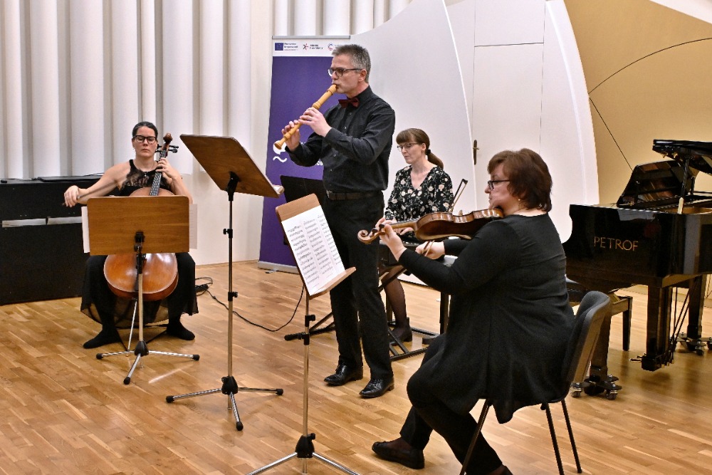 Mezitím zněla klasika i moderna, Händel, Dvořák, Bacewicz, Mendelssohn, Manganiho „Koncertní kus pro dva klavíry a klarinet“ ve strhující přednesu J.Antolčíkové, R.Hájka a A.Šefčíkové, ale i Big Beat Lukáše Hurníka v podání Saši a Magdy Pallasové. Dalším příjemným překvapením byl „Hungarian folksong“ (aut.I.Weijmans) s bicími nástroji a příčnou flétnou (B.Patáková, P.Šimberský, I.Krmíčková), jeho vášnivé tóny spojila scénickým tancem na pódiu i mezi diváky K.Pechová, kantorka tanečního oboru.