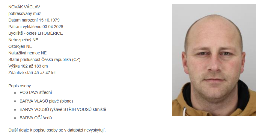 LITOMĚŘICKO / ÚSTÍ NAD LABEM – Policisté na Litoměřicku vyhlásili celostátní pátrání po 46letém Václavu Novákovi. Muž byl naposledy viděn ve čtvrtek 2. dubna v obci Zahořany, odkud odjížděl do zaměstnání. Od té doby o sobě nepodal žádnou zprávu. Situace je o to vážnější, že jeho vozidlo bylo nalezeno opuštěné v krajském městě.