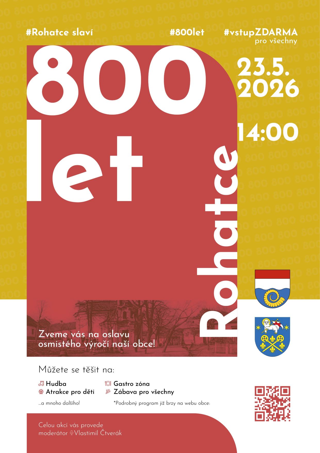 ROHATCE – Rohatce, místní část obce Hrobce, si letos připomínají významné jubileum – 800 let od první písemné zmínky. Oslavy tohoto výročí se uskuteční v sobotu 23. května 2026 od 14:00 hodin přímo v Rohatcích a nabídnou pestrý program pro všechny generace.