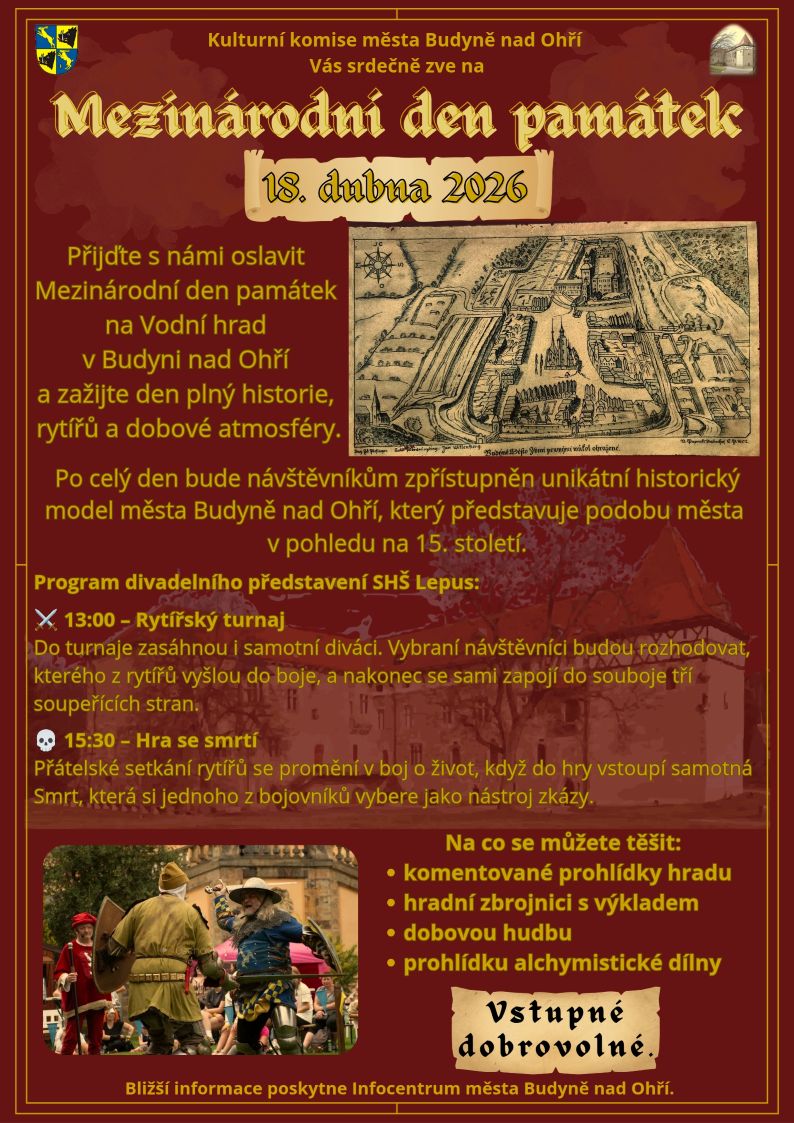 BUDYNĚ NAD OHŘÍ – Máte rádi historii, řinkot zbraní a atmosféru středověku? Kulturní komise města Budyně nad Ohří vás v sobotu 18. dubna zve na oslavy Mezinárodního dne památek. Program na tamním Vodním hradě slibuje zážitek pro celou rodinu.