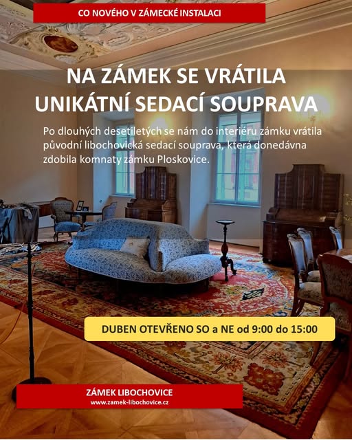 LIBOCHOVICE – Máte rádi příběhy s dobrým koncem? Jeden takový se právě odehrál na státním zámku v Libochovicích. Do jeho bohatě zdobených interiérů se po dlouhých desetiletích vrátila původní sedací souprava, která tvořila srdce zdejších komnat, než na čas „hostovala“ u sousedů v Ploskovicích.